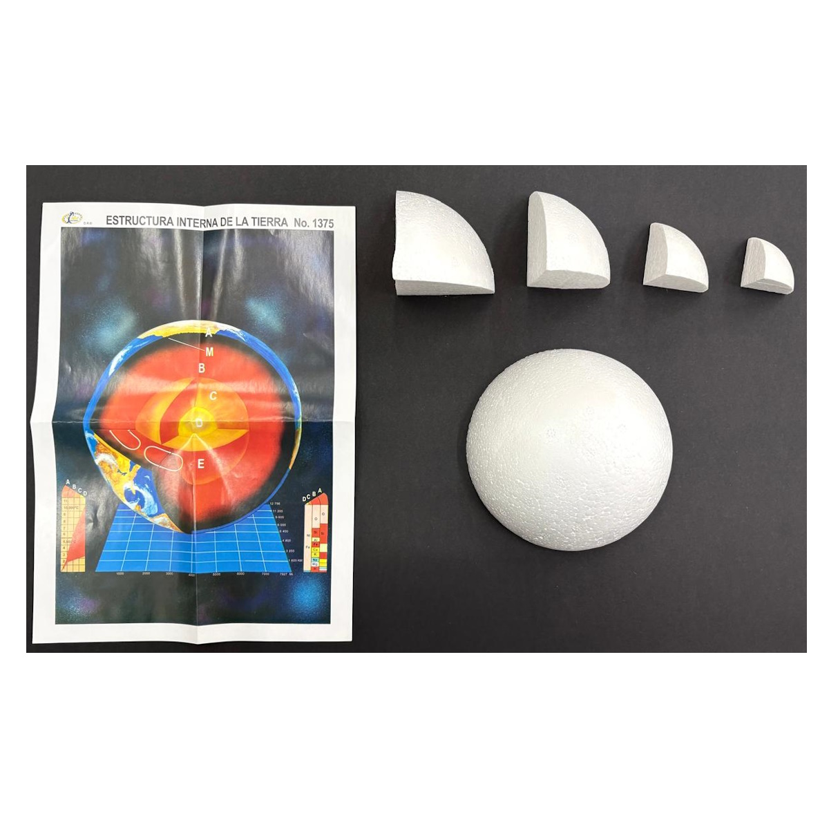 Capas de la tierra.  Ideal para trabajos escolares. Representa las capas internas de la tierra con partes recortadas en unicel.  Listo para pintar y pegar.  Utilica silicon frío para unir las piezas.